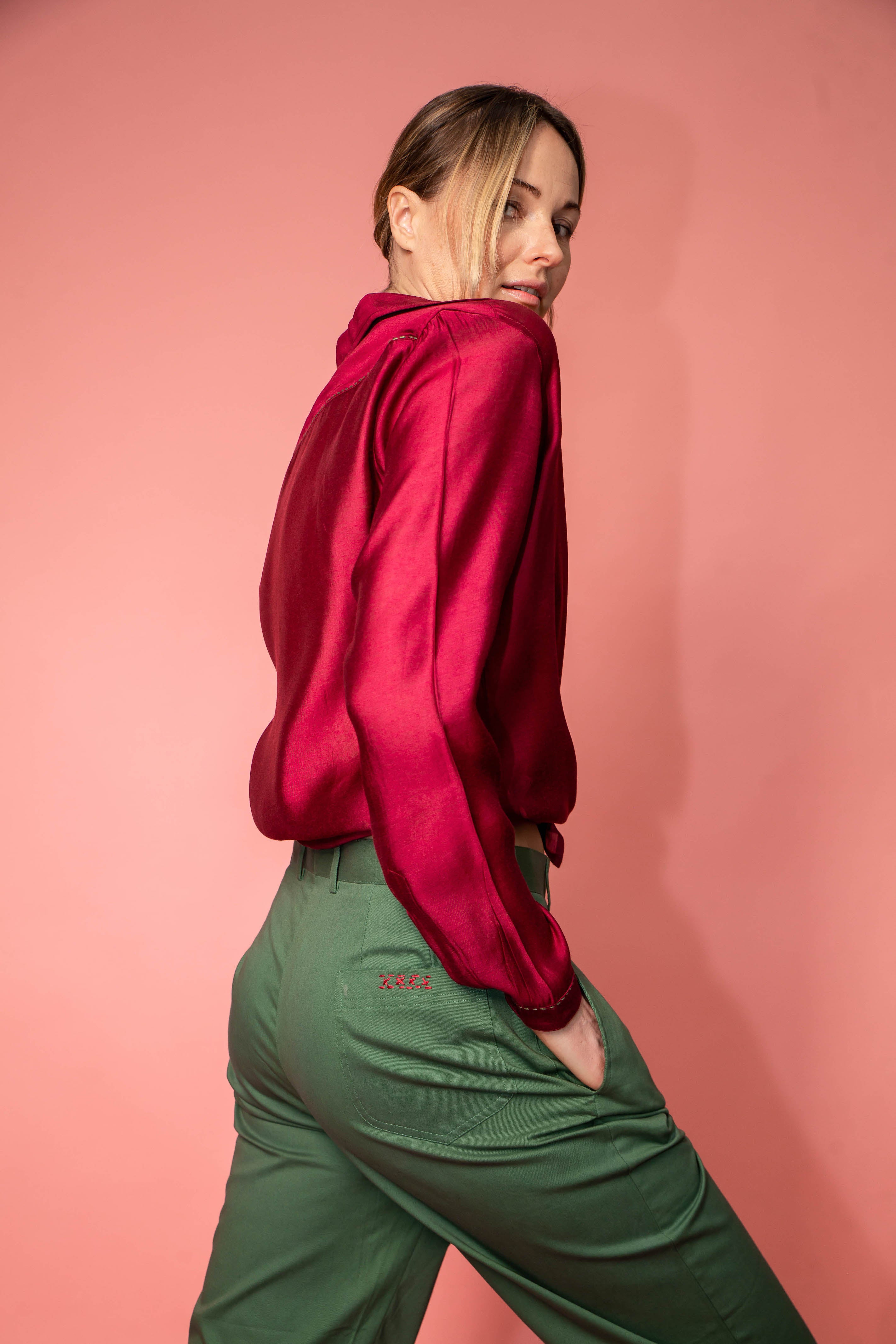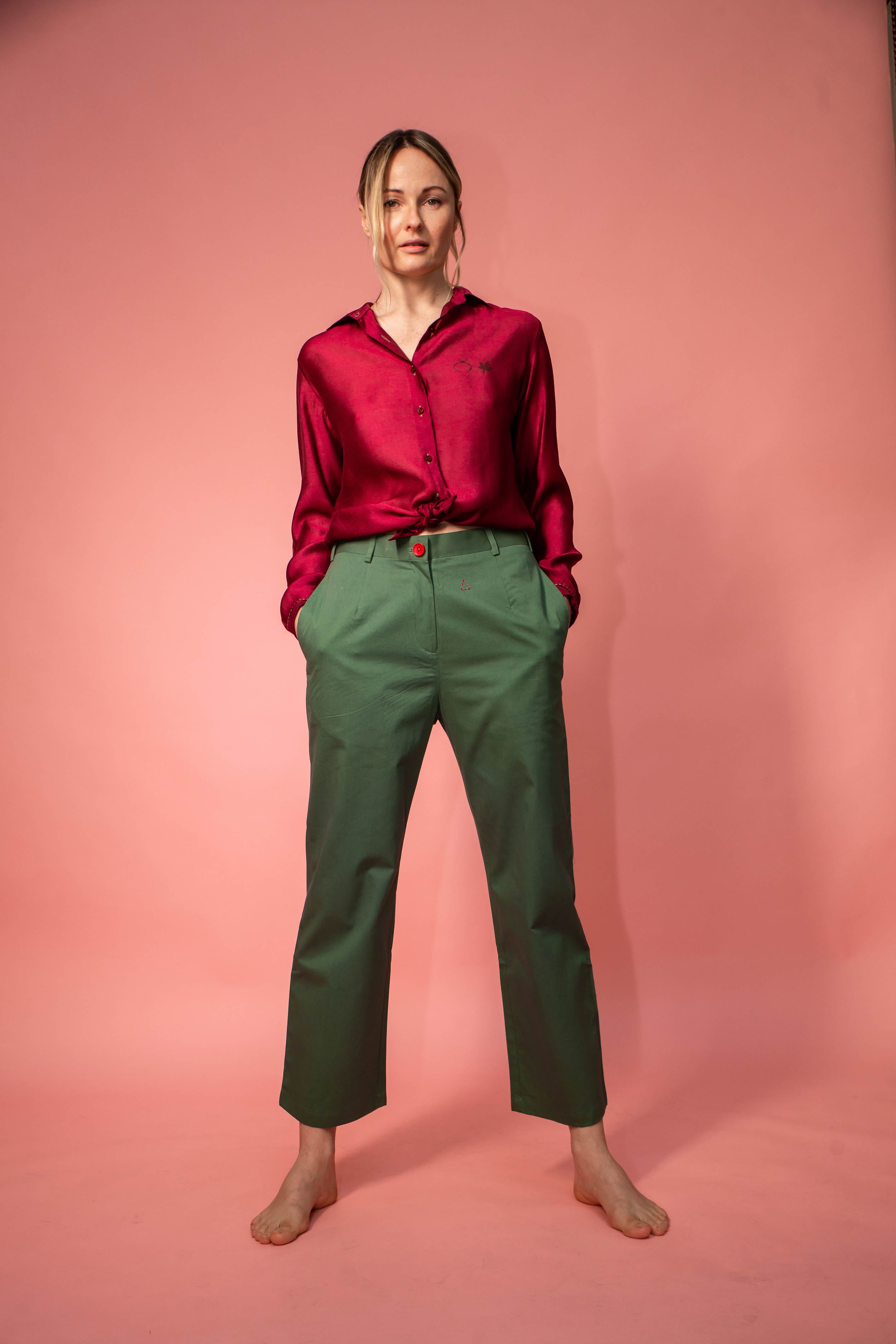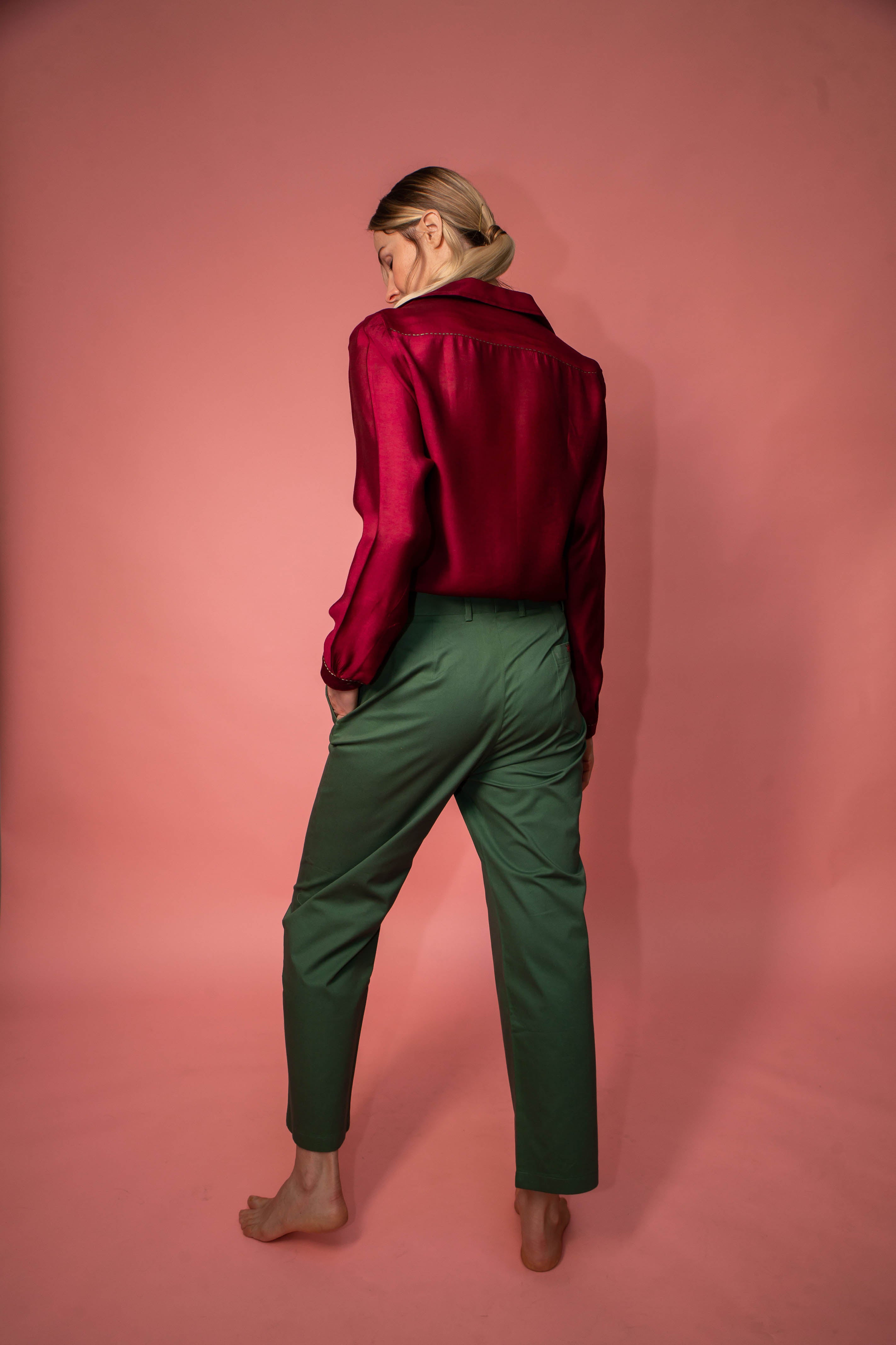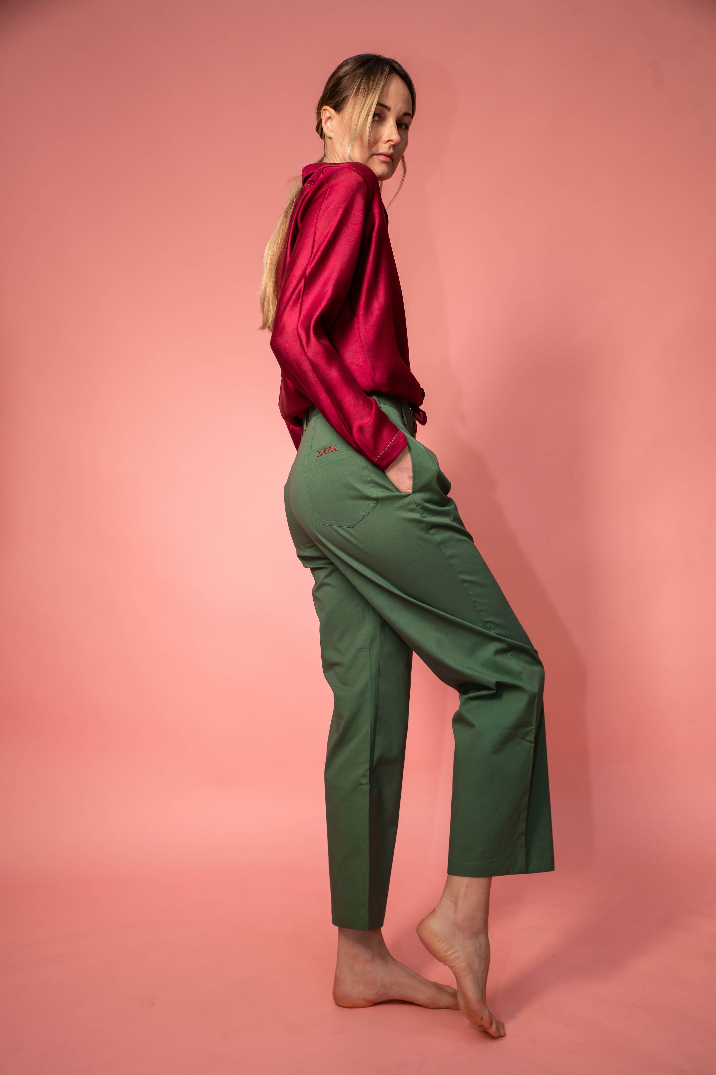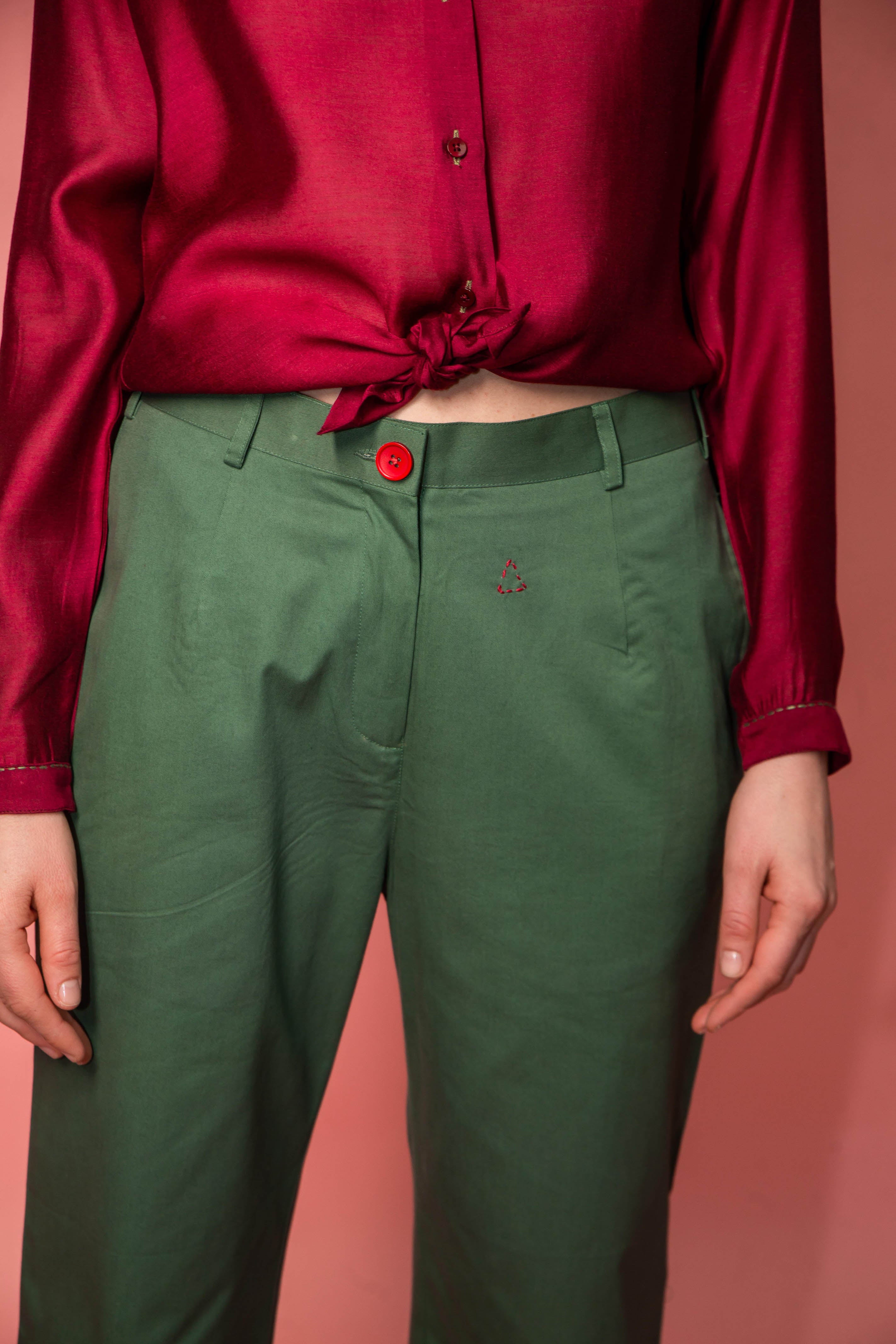 Pure cotton trousers, loose cut with small hand-sewn details on the front and back.