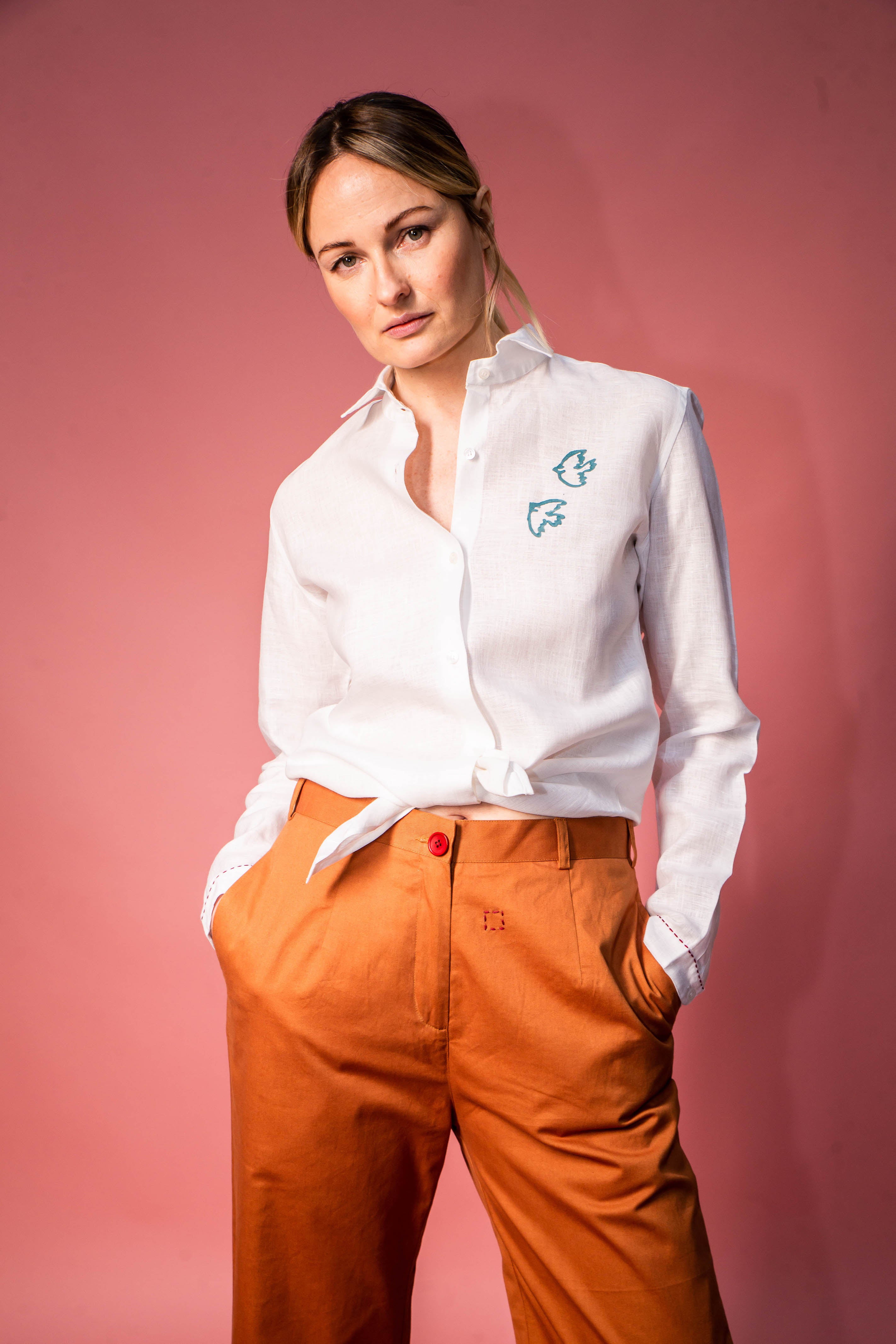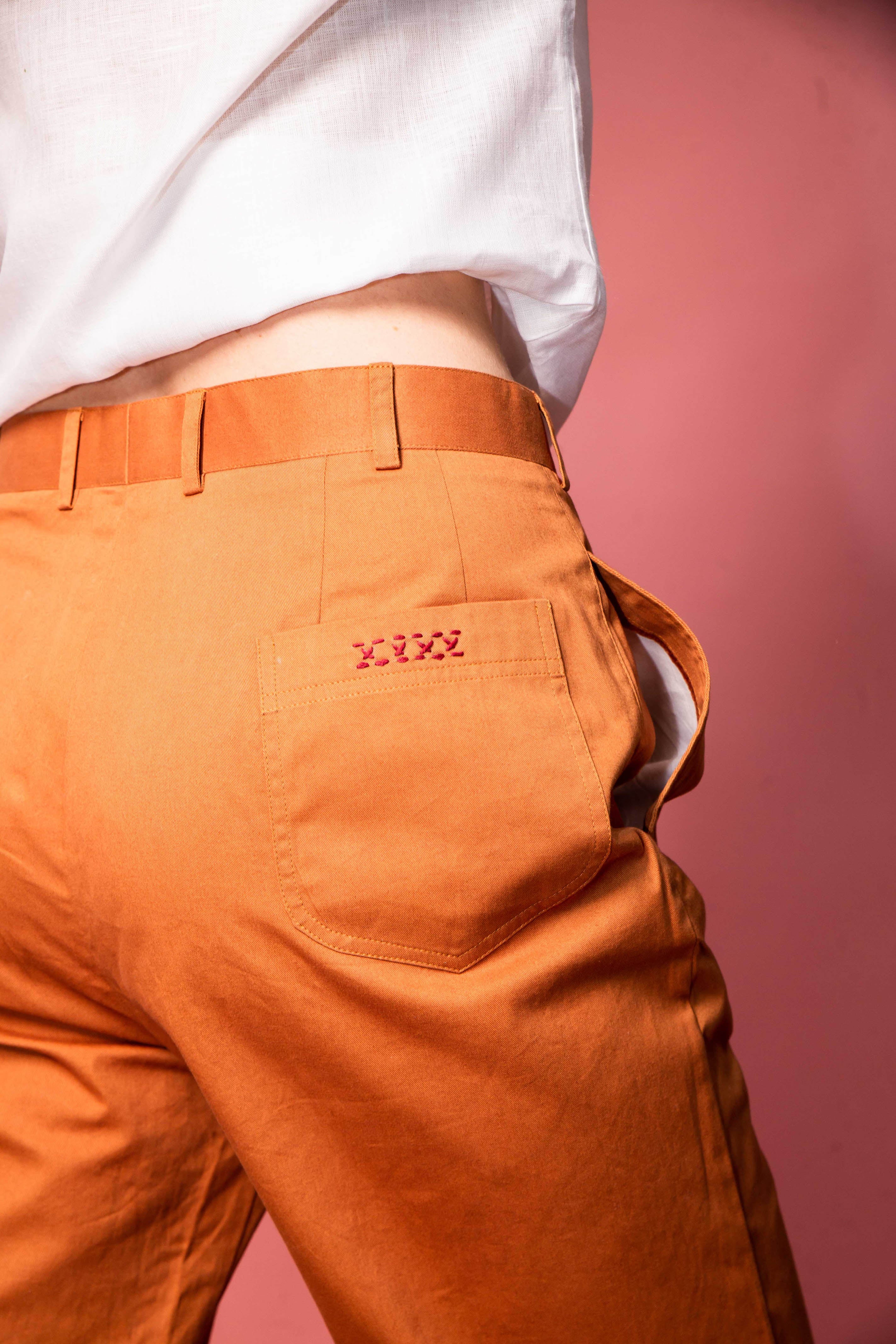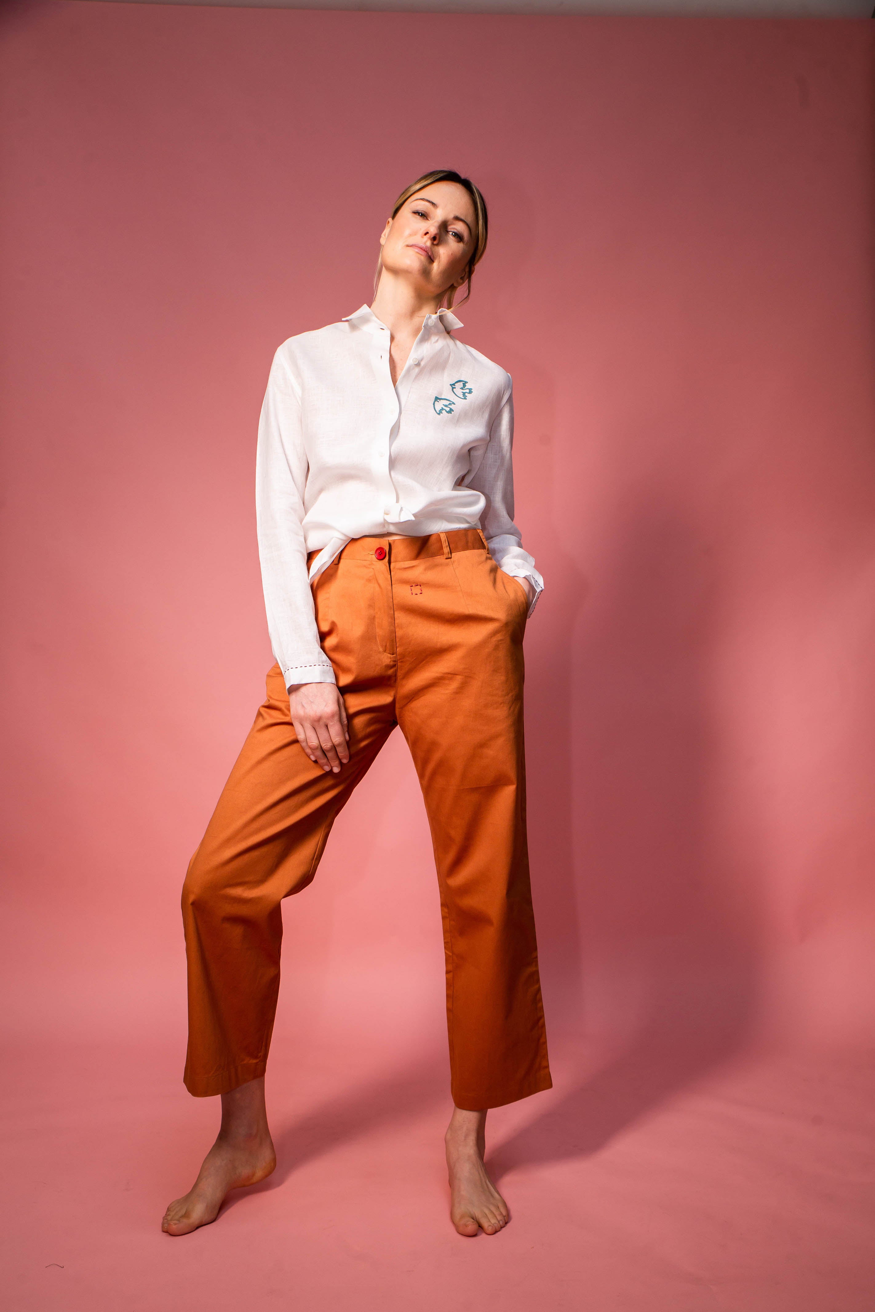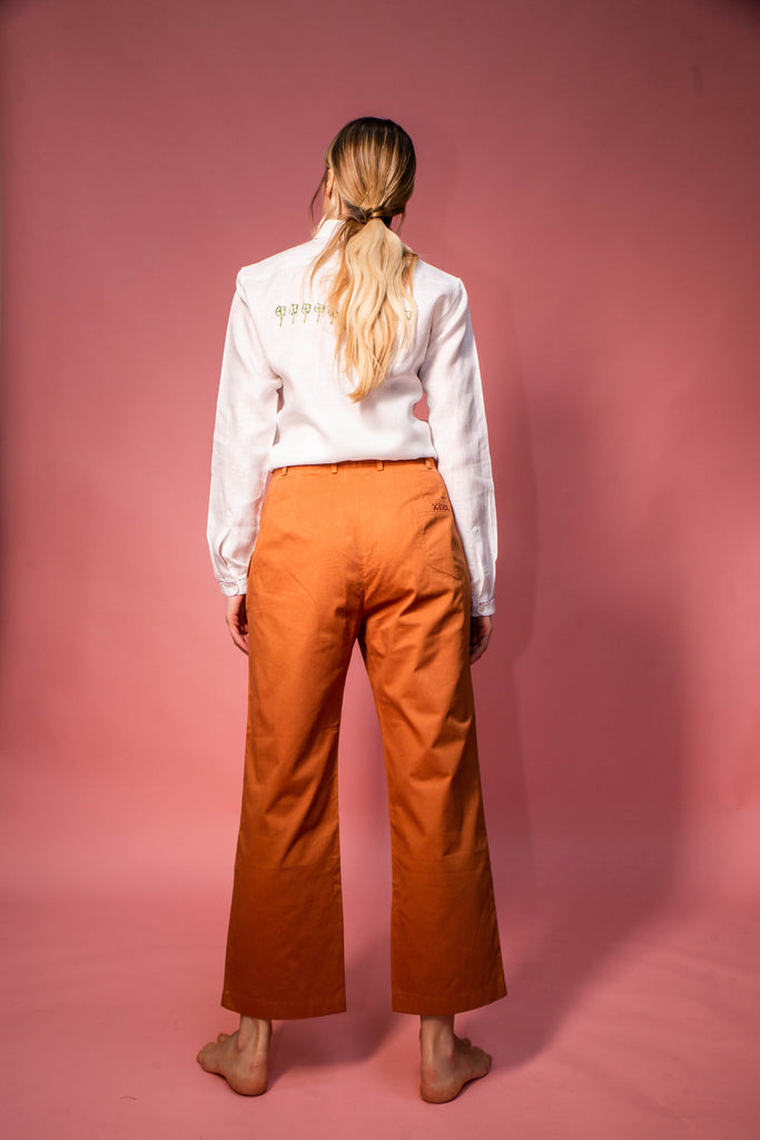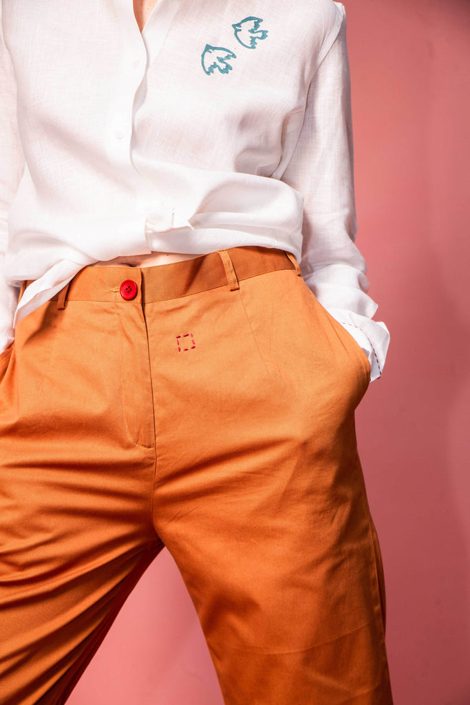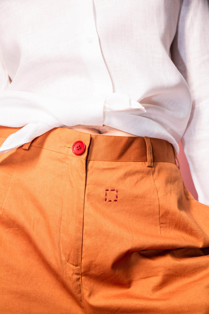 Pure cotton trousers, loose cut with small hand-sewn details on the front and back.